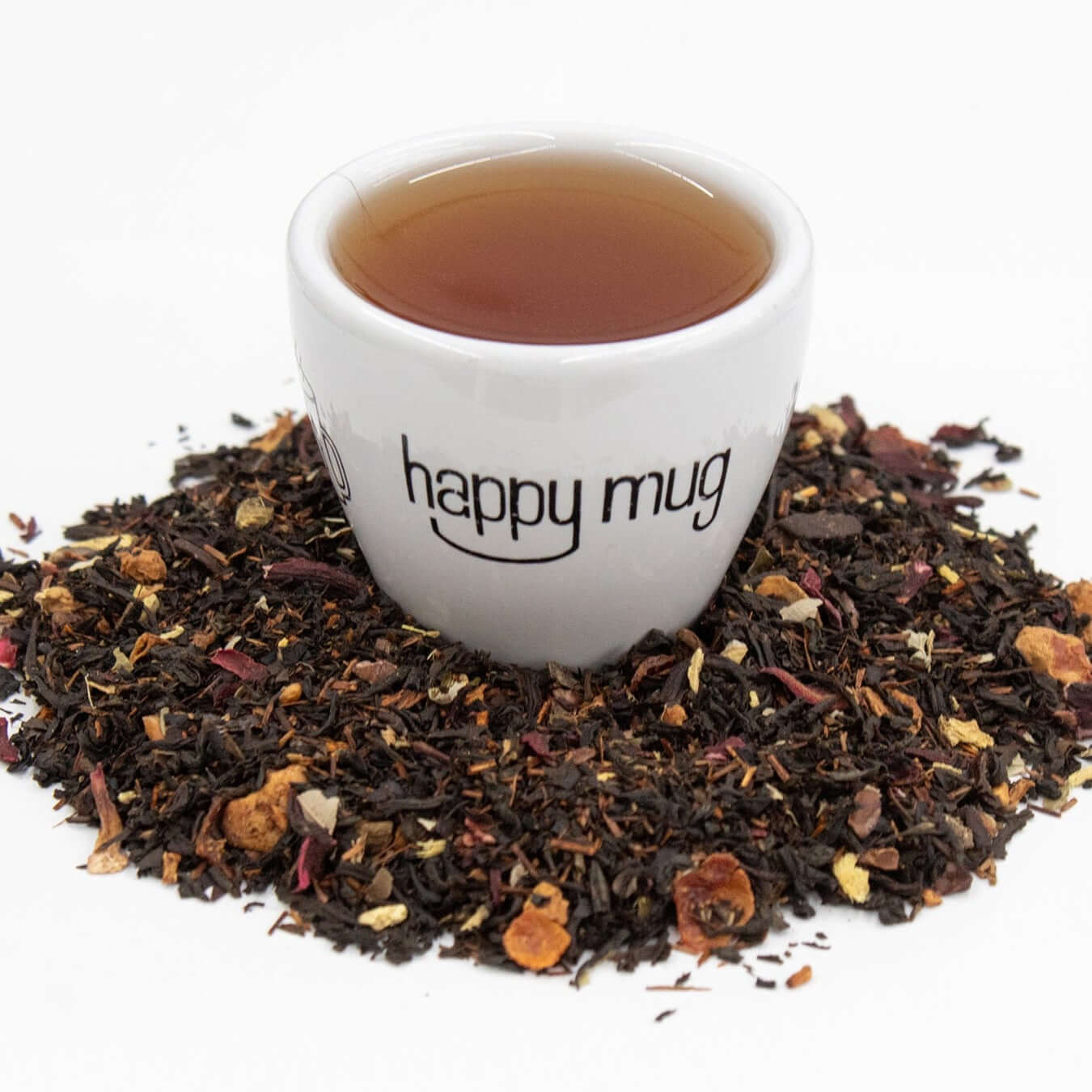 Tea, fruits, and chocolate come together to create this inspirational blend. Black tea is the base, enhanced with chocolate and sweetened with raspberry and coconut. Rosehips add aroma. It is sweet enough to drink it straight, and the flavors blend remarkably well.