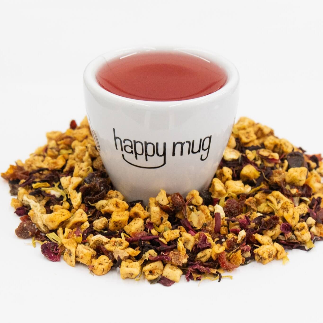 Ingredients: Orange Peel, Apple Pieces, Hibiscus, Rose Hips, Cranberries, Spearmint, Rose Petals, Safflowers, Marigold Flowers, Natural Flavor, Citric Acid.