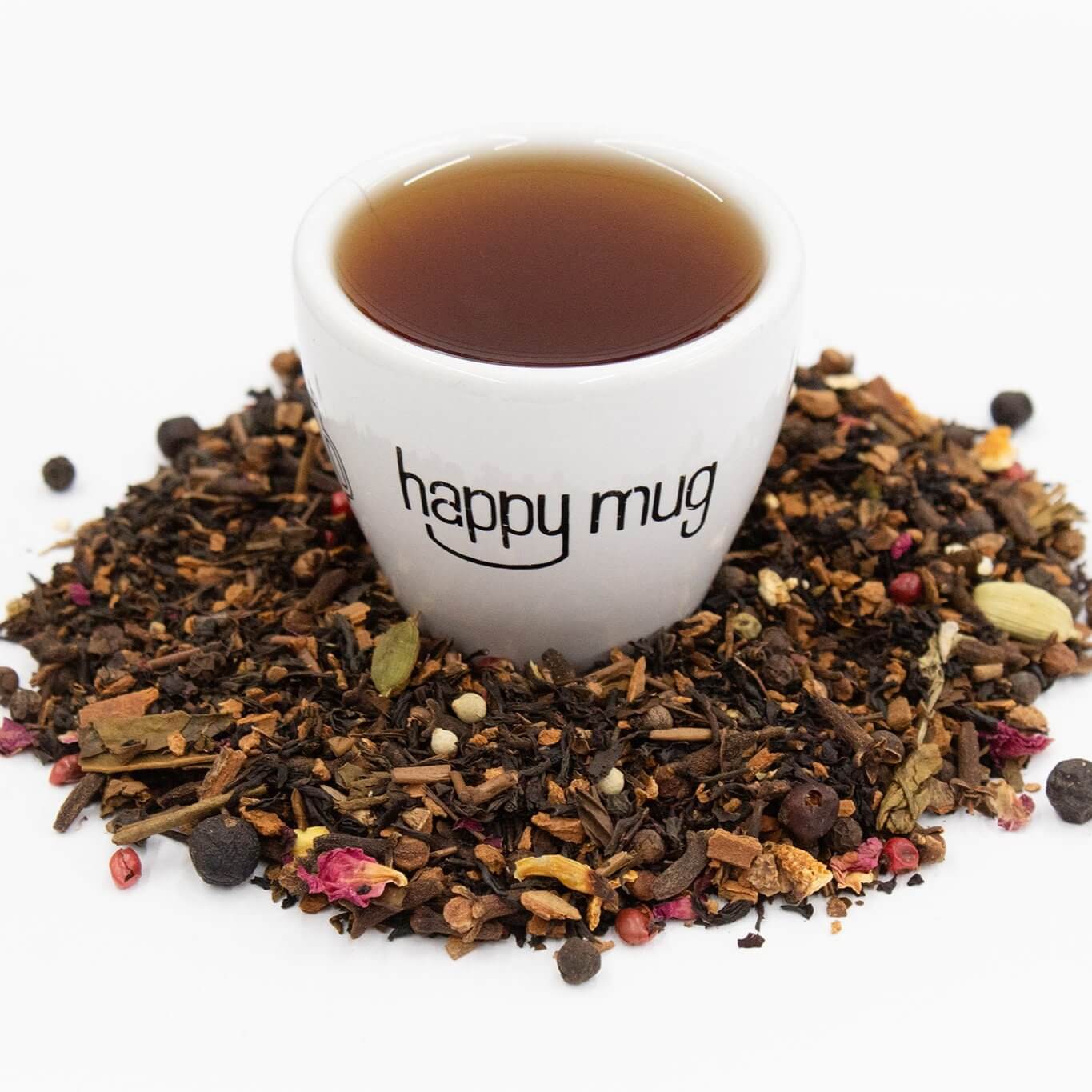 This tea has the warming, almost magical spices and herbs often used to make chai tea, but has a great black tea base and is intended to just be steeped like a normal tea and drink it straight. An excellent choice of tea for a chilly day.