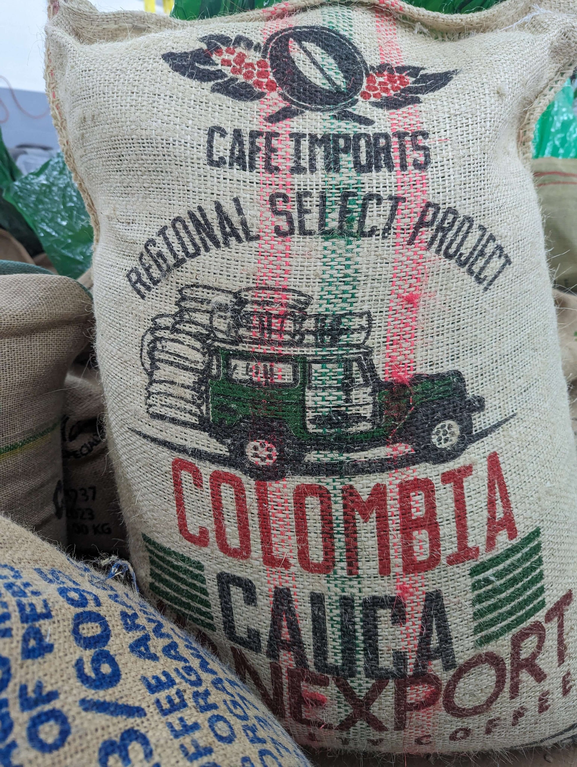 Colombian coffee beans -- the really good lots -- tend to get lost among the millions of bags of ordinary beans, and the small farmers are doing what they can to stand out when they really have a good harvest like this one. This is a Supremo lot, which means they sorted out the larger beans (as opposed to the slightly smaller Excelso).